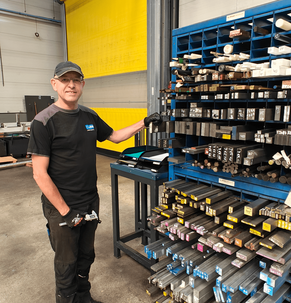 “Ik hou van orde, netheid en structuur en ook van het optimaliseren van processen. Bij De Ploeg was ik daar naar ieders tevredenheid ook veel mee bezig. Hier bij v.d. Elsen (WILVO Precision) zie ik ook dat mijn aanpak gewaardeerd wordt.” Voorbeeld? “Nou, ik kan niet zonder mijn witte stift. Die gebruik ik voor de benaming van het artikel op de kopse zijde. Zo zie je in één oogopslag welke materialen er in het rek liggen. Het is maar een detail, maar het zorgt wel voor overzicht. Logischerwijs controleer ik al het materiaal bij binnenkomst op de gewenste specificaties, match ik materiaal en werkorder en zorg ik voor een goede sortering. Recent is de zagerij verhuisd en ben ik nog volop bezig met de meest optimale en efficiënte inrichting. Noem het ‘de basis op orde brengen’, om het werk uiteindelijk makkelijker te maken en foutmarges te minimaliseren.”
